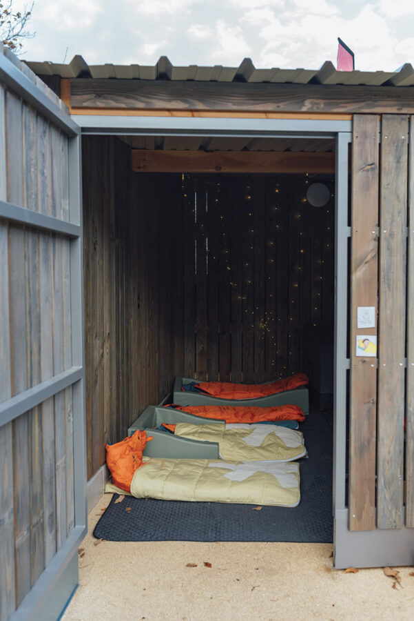 Au bout de la pelouse, une sorte de cabane de jardin demeure ouverte. La fraîcheur matinale passe à travers les planches de ses murs. Des matelas équipés de duvets sont posés à même le sol. “C’est l’unique espace de sieste”, explique la directrice, précisant qu’une petite maison équipée d’un préau permet de s’abriter lors des intempéries extrêmes comme les grosses pluies ou les fortes chaleurs. “Mais pas pour des journées entières.” Autrement dit : même s’il pleut un peu ou s’il neige, tout se déroule à l’air libre. Les repas, les jeux et les siestes. Le matériel adapté à la météo (vêtements, duvets) est fourni par l’établissement.