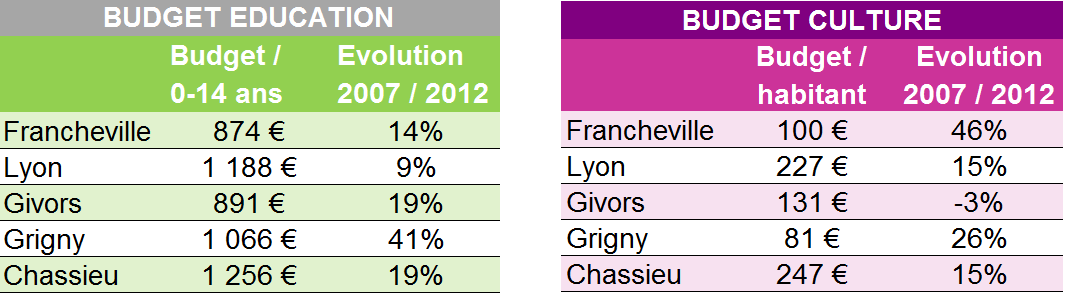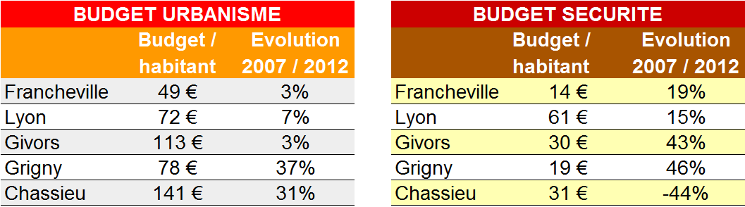 Tous les critères n'apparaissent pas par souci de compréhension des tableaux. Les résultats complets des 12 principales villes de l’agglomération sont disponibles dans le numéro de janvier 2014 de Lyon Capitale. Nous avons choisi de confronter ces chiffres à ceux de trois municipalités de gauche et de population proche, Givors, Grigny et Chassieu, en gardant Lyon comme ville-témoin.
