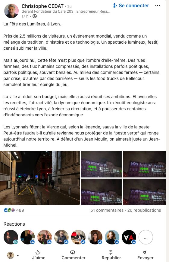 Ce dimanche soir, le patron du 203, membre du collectif des "défenseurs de Lyon", Christophe Cédat a publié sur Linkedin un message déplorant une fête qui "n'est plus que l'ombre d'elle-même", accusant les écologistes d'avoir "réussi à éteindre Lyon, à freiner sa circulation, et à pousser des centaines d'indépendants vers l'exode économique". Et de conclure : "Les Lyonnais fêtent la Vierge qui, selon la légende, sauva la ville de la peste. Peut-être faudrait-il qu’elle revienne nous protéger de la “peste verte” qui ronge aujourd’hui notre territoire. À défaut d’un Jean Moulin, on aimerait juste un Jean-Michel."