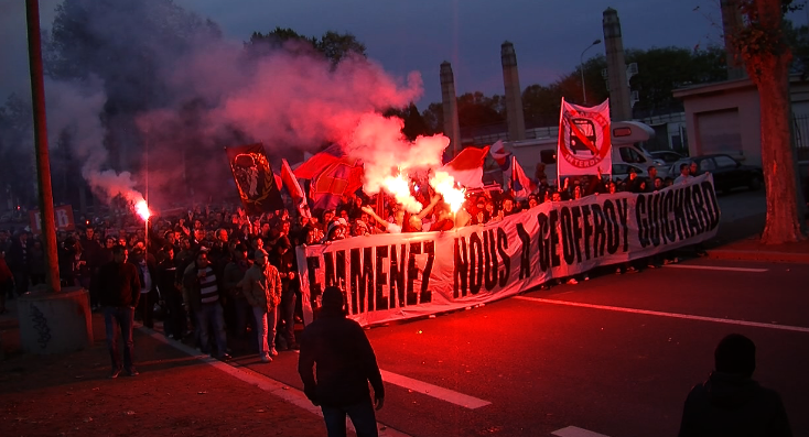 En début de cortège, les fidèles du Virage Nord ont déployé une banderole : "Emmenez-nous à Geoffroy-Guichard." Car si l’idée des Bad Gones étaient avant tout de soutenir la bande à Rémi Garde avant le derby de dimanche face à "l’ennemi" stéphanois, les supporters lyonnais tenaient également à dénoncer la décision des autorités (arrêtés de la préfecture de la Loire et du ministère de l’Intérieur) leur interdisant de se rendre dans la Loire pour soutenir leur équipe. Une première dans l’histoire des derbys.