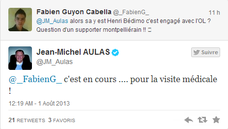 Dans la soirée, Jean-Michel Aulas a confirmé via son compte Twitter, la venue imminente du Montpelliérain.