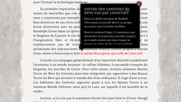 En effet, des interactions viennent se mêler au texte et de superbes illustrations de Nicolas Fructus transportent le lecteur dans un univers sombre, mystérieux, effrayant ! De plus, les concepteurs de cette application ont innové avec une lecture uniquement verticale et la possibilité de lire de différentes manières. Tout d'abord, il ne faut pas oublier que Kadath, le guide de la cité inconnue est un roman et non un jeu vidéo - malgré quelques ressemblances - et que le lecteur peut donc décider de lire de manière linéaire ces 160 pages.