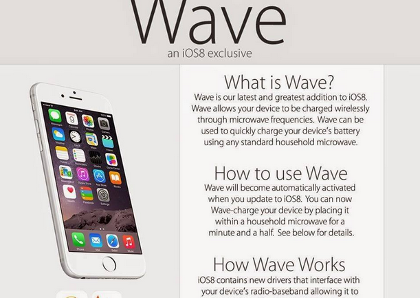 La blague revient régulièrement sur les réseaux sociaux, il serait possible de recharger son iPhone avec un micro-ondes. Dernièrement, une jolie publicité bien réalisée informée les utilisateurs que le système iOS 8 permettait de débloquer cette fonction.