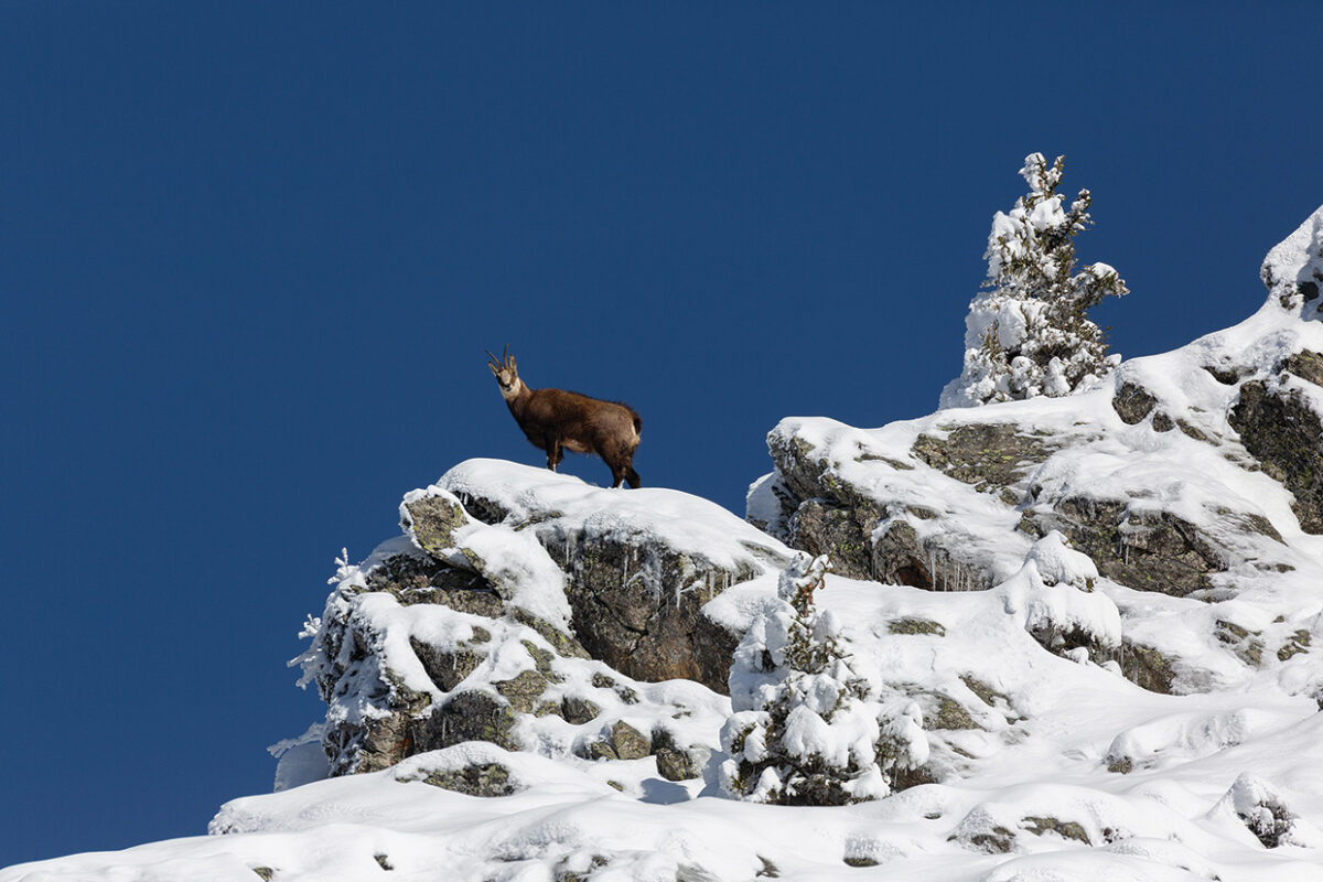 Les chamois sont obligés de descendre là où la neige est moins épaisse dans l’espoir de trouver quelques brins d’herbe à grignoter © Lionel Montico